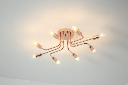 Equipado com 8 soquetes E14, o plafon garante excelente potencial luminoso. Assim, é possível personalizar a iluminação conforme a necessidade do espaço, utilizando lâmpadas quentes para um clima mais acolhedor ou lâmpadas frias para destacar detalhes. Consequentemente, o ambiente se torna mais confortável, funcional e bem iluminado.